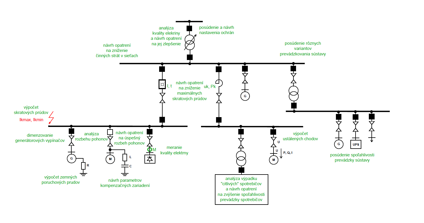 Grafické znázornenie niektorých nami ponúkaných služieb z oblasti výpočtov a optimalizácie prevádzky elektrických sústav je na nasledovnom obrázku.